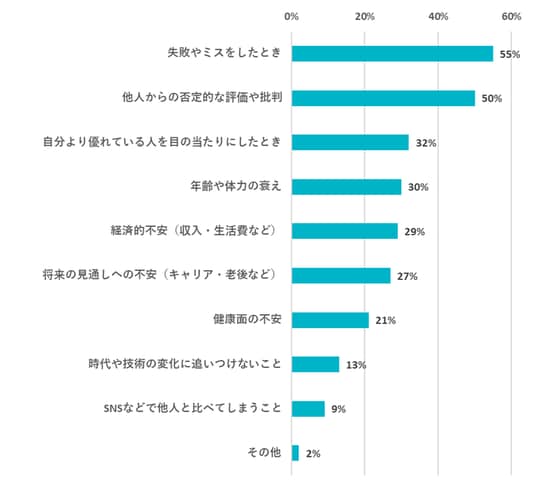 - 自信を揺るがすのは失敗と評価のプレッシャー「失敗やミス」(55%)、「他人からの否定的な評価」(50%)が上位。社会的評価や挫折経験が、自信を失う大きな要因となっている。