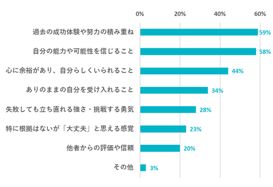 最も多かったのは「過去の成功体験や努力の積み重ね」(59%)で、「自分の能力や可能性を信じること」(58%)が僅差で続きました。いずれも、自信を“自らの行動や成果に裏づけられた感覚”として捉える傾向がうかがえます。
