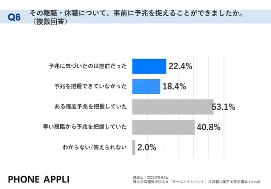 直近半年間に部下の離職・休職を経験した管理職のうち40.8%が、「予兆に気づいたのは直前だった」(22.4%)または「予兆を把握できていなかった」(18.4%)と回答しました。その一方で、同調査では約8割の管理職が、普段から「優先的にケアするメンバー」を「特定できている」または「概ね特定できている」と回答しており、自己認識と実態との間に乖離があることがうかがえます。