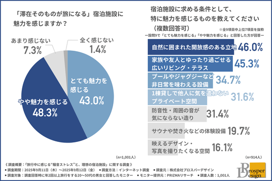 宿泊施設での理想の過ごし方を踏まえて、「『滞在そのものが旅になる』宿泊施設に魅力を感じるか」について尋ねたところ、9割以上の方が『とても魅力を感じる(43.0%)』『やや魅力を感じる(48.3%)』と回答しました。