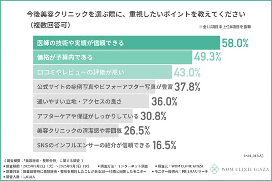 美容クリニック選びの際に重視されているのは、「医師の技術力」「価格」「口コミ」といった要素でした。これは、美容施術・整形に対する安心と、無理のない範囲での選択を両立させたいという、ユーザーの現実的かつ慎重な姿勢を反映していると考えられます。