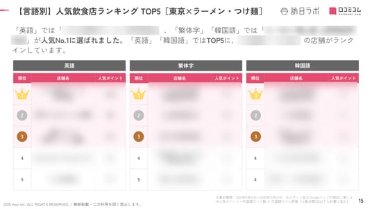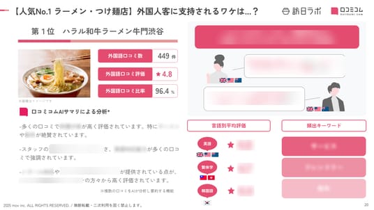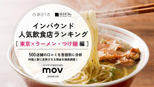業界最大級のインバウンドビジネスメディア「訪日ラボ」及び 店舗向け集客一元化プラットフォーム「口コミコム」を運営する株式会社mov(代表取締役:渡邊 誠、本社:東京都渋谷区、以下mov)は、東京都のラーメン・つけ麺店に寄せられた最新の口コミデータから、独自の『インバウンド人気飲食店ランキング』を発表しました。