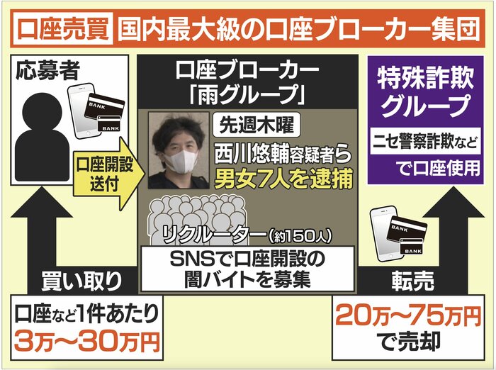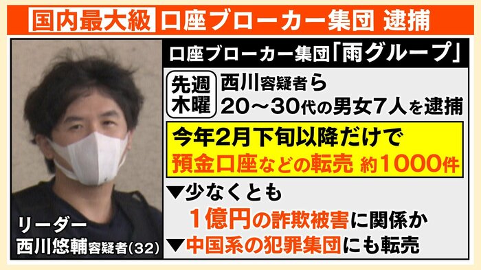 10月16日、日本最大級の“口座ブローカー”集団「雨グループ」リーダーの西川悠輔容疑者(32)ら、20代から30代の男女7人が逮捕されました。
