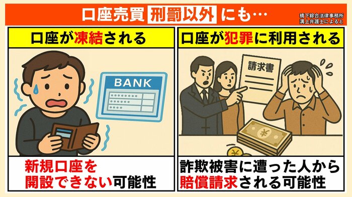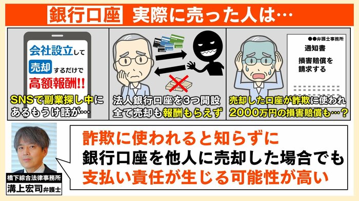 橋下綜合法律事務所の溝上宏司弁護士によると、「詐欺に使われると知らずに銀行口座を他人に売却した場合でも、支払い責任が生じる可能性が高い」といいます。