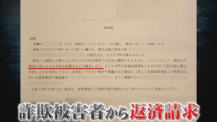 詐欺グループに悪用され、この口座にお金を振り込んだ被害者から返済を求められたのです。