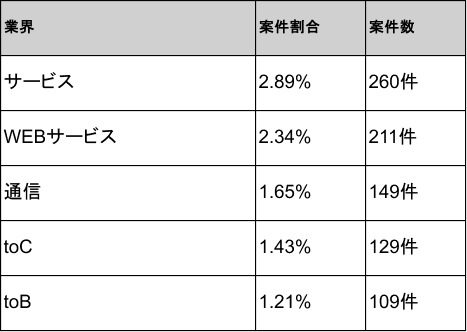2025年10月時点のKotlin案件は、サービスが2.89%(260件)で1位、Webサービスが2.34%(211件)で2位、通信が1.65%(149件)で3位、toCが1.43%(129件)で4位、toBが1.21%(109件)で5位となり、上位5業界で全体の約9.5%を占めます。