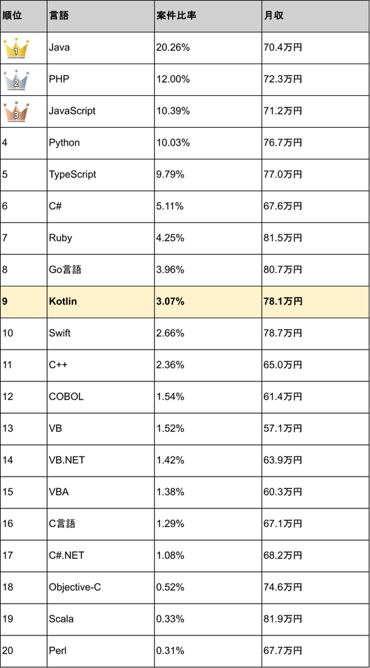 2025年10月時点でKotlinの案件は市場全体の3.07%を占め、案件数は9位、平均月額単価は78.1万円と安定しています。