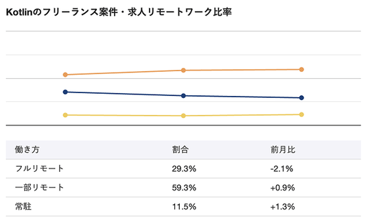 2025年10月時点のKotlinフリーランス案件・求人におけるリモートワーク比率は、フルリモートが29.3%、一部リモートが59.3%、常駐が11.5%です。前月比はフルリモートが−2.1%で減少し、一部リモートは+0.9%で増加、常駐は+1.3%と小幅に上昇しています。