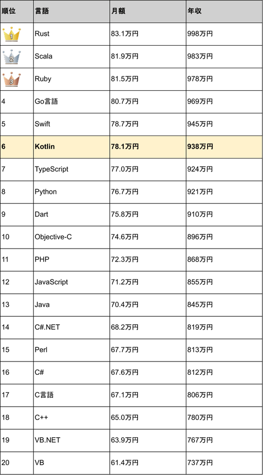 Kotlin案件の平均月額単価は78.1万円、平均年収は938万円で、プログラミング言語別の年収ランキングでは6位に位置しています。