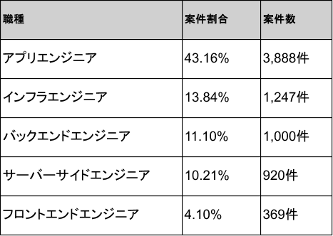 2025年10月時点のKotlin案件の職種は、アプリエンジニア43.16%(3,888件)が最多で、次いでインフラエンジニア13.84%(1,247件)、バックエンドエンジニア11.10%(1,000件)、サーバーサイドエンジニア10.21%(920件)、フロントエンドエンジニア4.10%(369件)となっています。