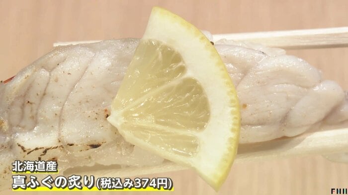 北海道産のあぶりフグの握りが300円台とお手ごろに味わえる。