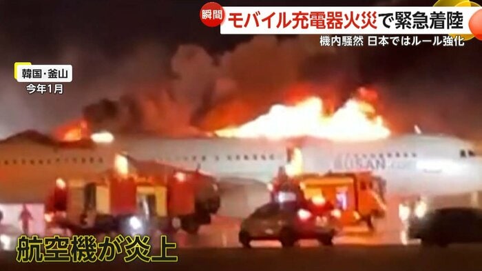 1月には韓国・釜山でも、モバイルバッテリーが原因とみられる火災で航空機が炎上した。