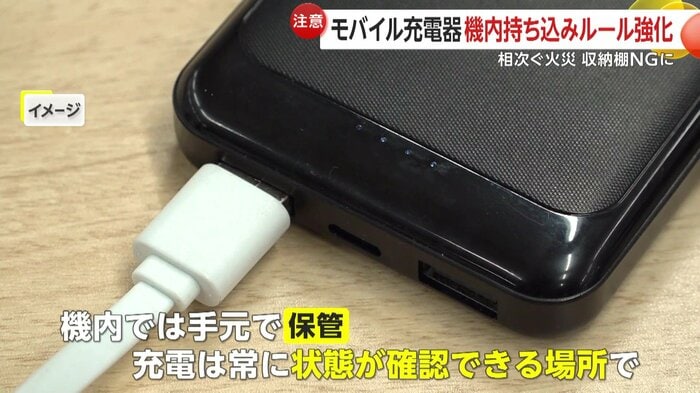 機内では手元で保管し、充電する際は常に状態が確認できる場所で行うよう求めている。