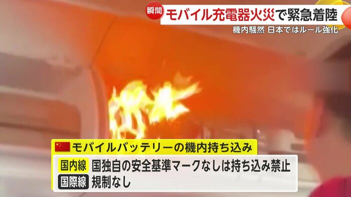 中国ではモバイルバッテリーによる火災が相次いでおり、国内線では中国独自の安全基準マークがないものは、機内への持ち込みが禁止されている。一方、国際線での規制はない。