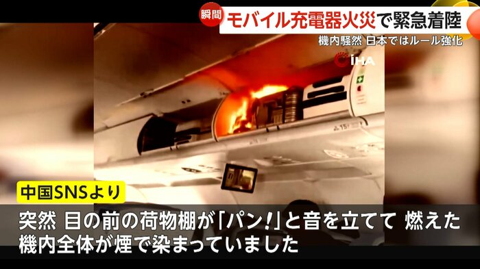当時の状況についてSNSには「突然目の前の荷物棚が『パン!』と音を立てて燃えた。機内全体が煙で染まっていました」との投稿も。