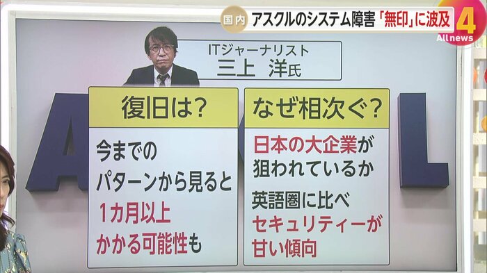 被害に遭っちゃうというか、キャンセルになっちゃうという方も中にはいらっしゃるかもしれませんが、復旧にはどれくらいかかるのかというところ。サイバー攻撃に詳しいITジャーナリストの三上洋さんに伺いました。現状、細かい情報が出ていないので何とも言えないが、これまでのパターンから見ると1カ月以上かかる可能性もあると。そして、ランサムウェアによる被害が相次いでいる背景としては、日本の大企業が狙われている節があるというのも、英語圏に比べてセキュリティーが甘い傾向にあるからということで、今後、完全に防ぐのは難しいので早期発見をして対処していく仕組みにしていくことが企業側に求められるということでした。企業側の取り組みってどうですか。