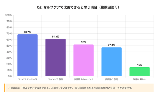 その結果、約73%の方が「マッサージやスキンケアで改善できる」と回答しました。適度なケアは予防に有効ですが、深く刻まれたほうれい線や進行したたるみは、セルフケアだけでの改善が難しいケースも多いのが実情です。