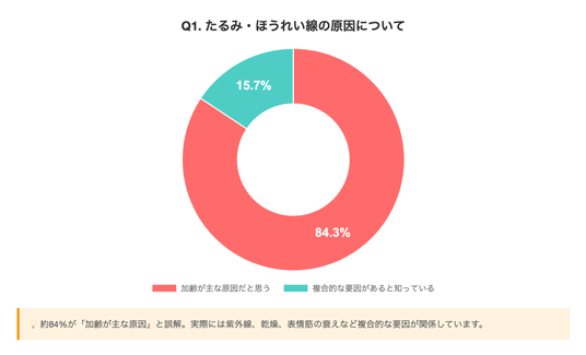 その結果、約84%の方が「加齢が主な原因」と回答し、多くの方が誤った認識を持っていることが分かりました。実際には、紫外線ダメージ、乾燥、表情筋の衰え、姿勢、生活習慣など、複合的な要因が関係しています。