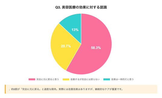 その結果、約58%の方が「美容医療を受ければ完全に若い頃の状態に戻る」と考えていることが判明しました。実際には、美容医療は改善や若返りの効果はありますが、元の状態に「完全に戻る」わけではなく、継続的なケアが必要です。
