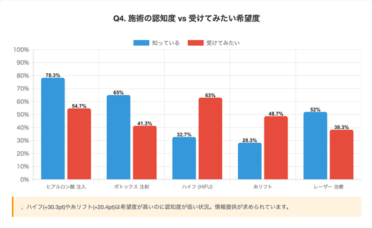 - 糸リフト: 認知度28.3% → 希望度48.7% (+20.4ポイント)