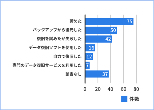 ◆復旧を諦めた人が4割以上 データを損失した際の対応について、「諦めた」と答えた人が最も多く41.2%、「復旧を試みたが失敗した」23.1%を合わせると、全体の6割以上がデータを復旧できていない実態が浮き彫りになりました。