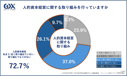 また、人的資本経営に関する取り組みの実施状況については、「あまり取り組めていない」(37.0%)、「全く取り組めていない」(26.1%)と、実に6割以上の企業が取り組みを行っていないことがわかりました。