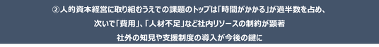 この結果により、時間や費用の工面だけでなく、外部知見の活用や支援制度の導入が人的資本経営を取り組むための今後の鍵といえます。
