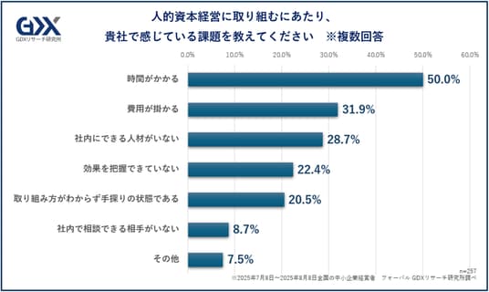 Q2で人的資本経営に取り組んでいると回答した経営者に取り組むにあたっての課題を尋ねた質問では、「時間がかかる」(50.0%)という回答が半数を占め最も多く、次いで「費用が掛かる」(31.9%)、「社内にできる人材がいない」(28.7%)、「効果を把握できていない」(22.4%)が続きました。また人材不足に関連し、「社内で相談できる相手がいない」(8.7%)という回答も見られ、人的資本についての取り組みを行うにあたっての時間や費用だけでなく、人材不足といった社内リソースの不足が顕著に現れる結果になりました。