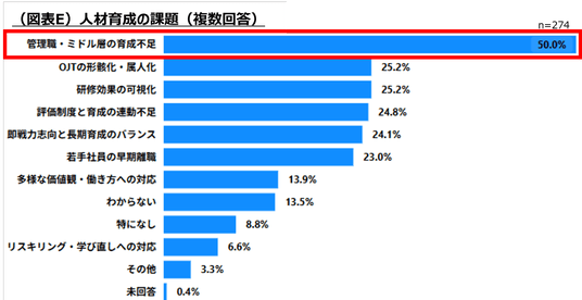 (4)管理職・ミドル層の育成不足が半数の企業で課題に