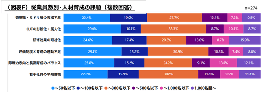 (図表F)従業員数別・人材育成の課題(複数回答)