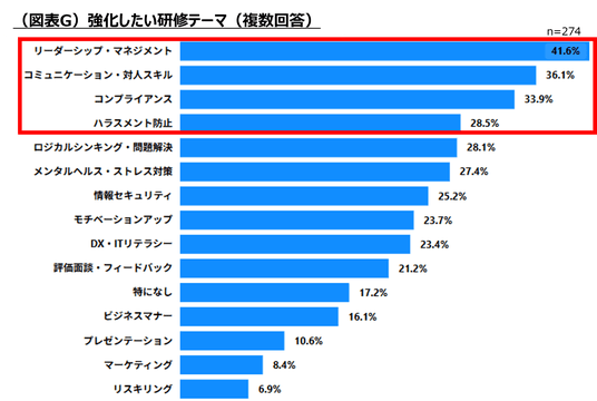 また、今後強化したいテーマとして「リーダーシップ・マネジメント」「コミュニケーション・対人スキル」が上位に挙がり、管理職層の育成ニーズの高まりが浮き彫りとなりました。