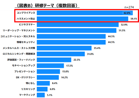 実施テーマの上位は「コンプライアンス」(62.0%)、「ハラスメント防止」(59.1%)、「ビジネスマナー」(52.9%)、「リーダーシップ・マネジメント」(51.5%)となりました(図表B)。近年の企業不祥事やコンプライアンス意識の高まりを受け、自社を守る教育への注力がうかがえます。