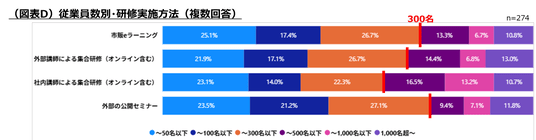 上位4項目を従業員数別で見ると、300名以下の企業では「外部の公開セミナー」、301名以上では、オンラインを含む「外部講師・社内講師による集合研修」が多く採用される傾向が見られました。(図表D)