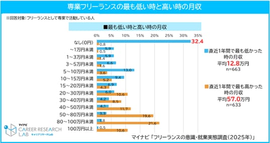 月収では、月ごとに大きな振れ幅があることがわかった。直近一年間で多い時の月収平均は57.0万円であるのに対し、少ない時の平均は12.8万円まで下がり、収入が0円だった月がある人も32.4%にのぼる。