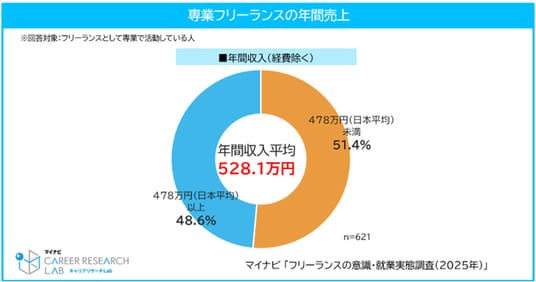 ◆専業フリーランスの年間収入平均は528.1万円
