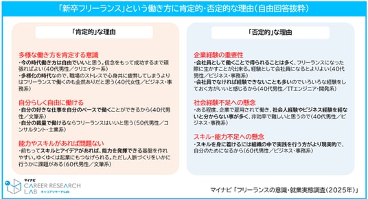 肯定的な理由の自由回答をみると、「今の時代働き方は自由でいいと思う」「自分の好きな仕事を自分のペースで働くことができる」という声があり、「多様な働き方を認める意識」や、「自分らしく働ける自由度の高さ」を理由に肯定的に捉える声が多くみられた。また、「能力やスキルが備わっていれば新卒でも問題なく働ける」という前向きな見方や、「若いうちに挑戦することが成長につながる」という意見なども寄せられた。一方で、否定的な理由としては、「企業で経験を積むことの重要性」や、「社会人としての基礎力やスキルの不足に対する懸念」などが挙げられた。【図5、6】