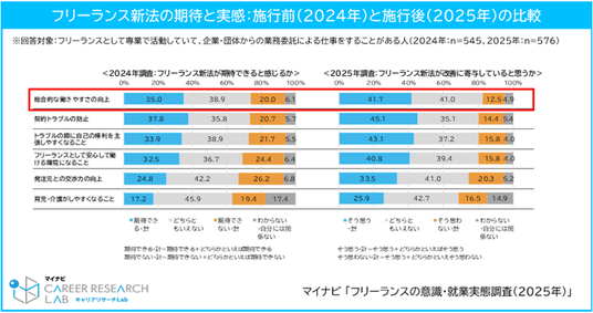 2024年11月に「フリーランス新法※1」が施行されてから1年が経過したことを受け、施行前に実施した「フリーランス新法への期待感」に関する調査結果※2と、現在の制度の効果に対する実感を比較した。