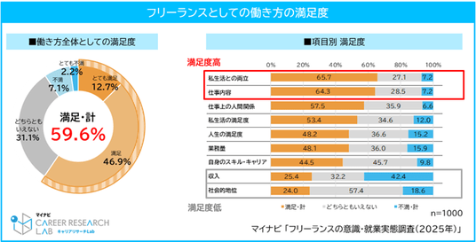 一方で、「収入(25.4%)」「社会的地位(24.0%)」は満足度が3割を下回っており、フリーランスという働き方における経済的・社会的な不安定さが課題として浮き彫りになった。