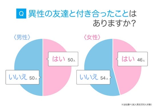 成人男女200人に、異性の友達と付き合ったことがあるか聞いたところ、約半数の人が「はい」と答えました。