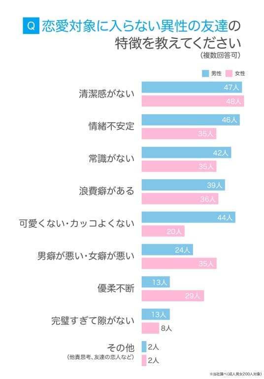 成人男女200人に、恋愛対象に入らない異性の友達の特徴を聞いたところ、「清潔感がない」と「情緒不安定」が上位にランクインしました。