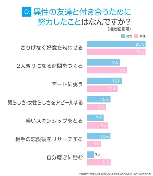 異性の友達と交際経験がある成人男女に、付き合うために努力したことを聞いたところ、「さりげなく好意を匂わせる」が最多回答でした。