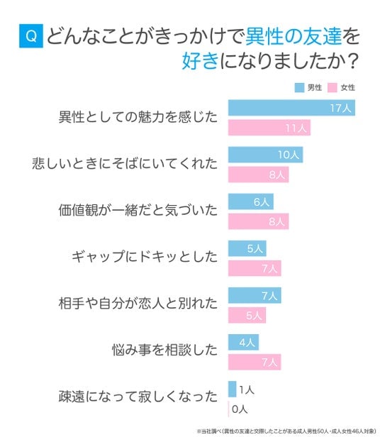 続いて、異性の友達と交際経験のある成人男女96人に、好きになったきっかけを聞いてみました。
