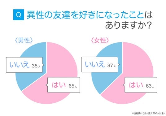 成人男女200人に、異性の友達を好きになったことがあるか聞いたところ、「はい」と答えた人が6割を超えました。