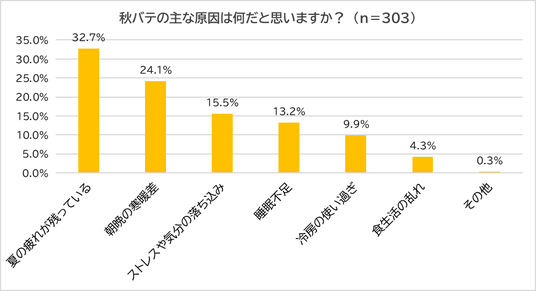 続いて、「主な原因」を尋ねたところ、「夏の疲れが残っている」(32.7%)が最多となり、「朝晩の寒暖差」(24.1%)と続きました。また、「睡眠不足」(13.2%)や「冷房の使い過ぎ」(9.9%)といった回答もあり、夏に酷使した身体が秋に入りリズムを取り戻せないまま不調を訴える“季節の反動”も見られました。
