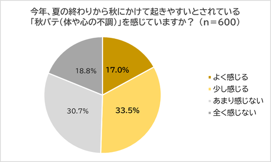 夏は終わったはずなのに、だるい・眠れない・やる気が出ない・・・など、なんとなくの不調が続いていませんか?この症状は「秋バテ」かもしれません。そこで、「今年、夏の終わりから秋にかけて起きやすいとされている『秋バテ(体や心の不調)』を感じているか?」と尋ねたところ、「よく感じる」(17.0%)、「少し感じる」(33.5%)となり、50.5%の人が秋バテを実感していると回答しました。一方で、「全く感じない」と答えた人は18.8%にとどまり、多くの人が夏から秋にかけて何ならかの不調を抱えていることがわかりました。