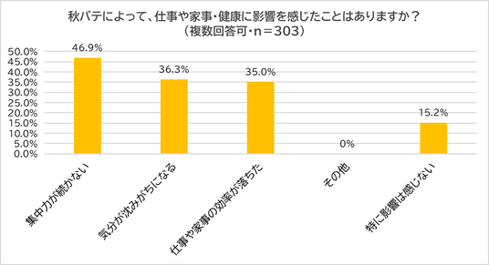 「秋バテによる仕事や家庭・健康への影響」では、「集中力が続かない」(46.9%)が最も多く、「気分が沈みがちになる」(36.3%)、「仕事や家事の効率が落ちた」(35.0%)と続きました。特に、働き盛り世代においては、パフォーマンスの低下やモチベーションの喪失にも繋がるため、秋バテは“軽視できない生活リスク”とも言えそうです。