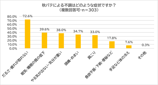 「秋バテを感じる」と回答した人303名に「具体的な症状」を尋ねたところ、「だるさ・疲れが取れない」(72.6%)が最も多く、次いで「眠気・睡眠の質の低下」(39.6%)、「やる気が出ない・気分が重い」(38・0%)となりました。