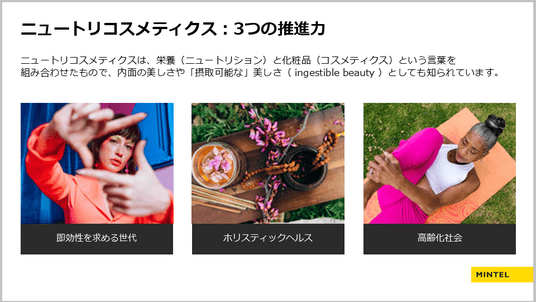 このインナービューティトレンドの広がりから、昨今注目されている「ニュートリコスメティクス」(栄養=ニュートリション、化粧品=コスメティクス を組み合わせた言葉)に言及し、それが消費者の間で受け入れられている背景として次の3つのポイントを解説しました。