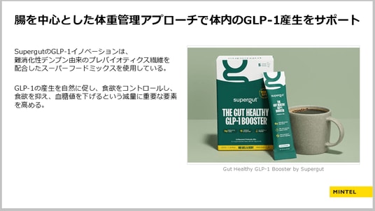 特に高齢者は「肌の健康」「体重管理」に関心が高く、腸活がそれに貢献することも、消費者は認識しています。「腸活×体重管理」の観点から注目される、革新的な製品として、“SupergutのGut Healthy GLP-1 Booster”を紹介しました。