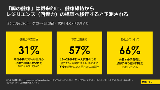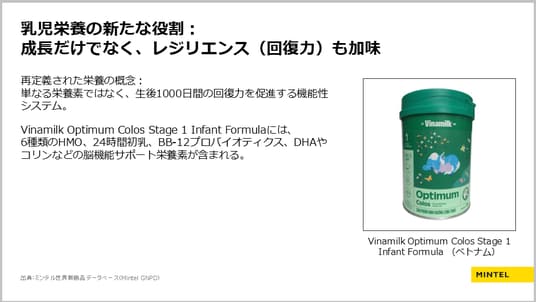 ミンテルが今月発表した『2026年:グローバル食品・飲料トレンド予測』では、現代に特有の日々変化する環境に対して、消費者がより耐性を高め、レジリエンス(回復力)を持てるように食品・飲料ブランドがどう貢献できるかを示しています。本講演の中でも、新生児用のミルクを一つの例として紹介しました。